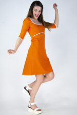 Die Taille rückt durch die Linie unter der Brust optisch nach oben und sorgt für lange Beine. Im Oberteil ist es anliegend, der Rock hat eine A-Linie. Der Ausschnitt ist großzügig, damit nichts verrutscht gibt es verdeckt eingearbeitete Clipse zur Befestigung am BH- Träger. Der Ausschnitt ist im Vorderteil eckig gearbeitet, im Rücken spitz zulaufend. Die Rückenpartie ist atemberaubend und zeigt viel Haut, der Ausschnitt endet jedoch vor der BH-Linie. Kombinieren Sie an kühlen Tagen einen unserer großzügigen Loopschals und Wendestulpen dazu.