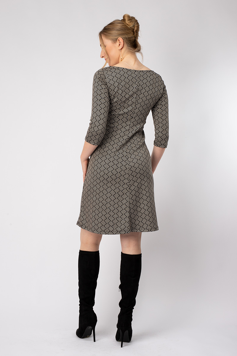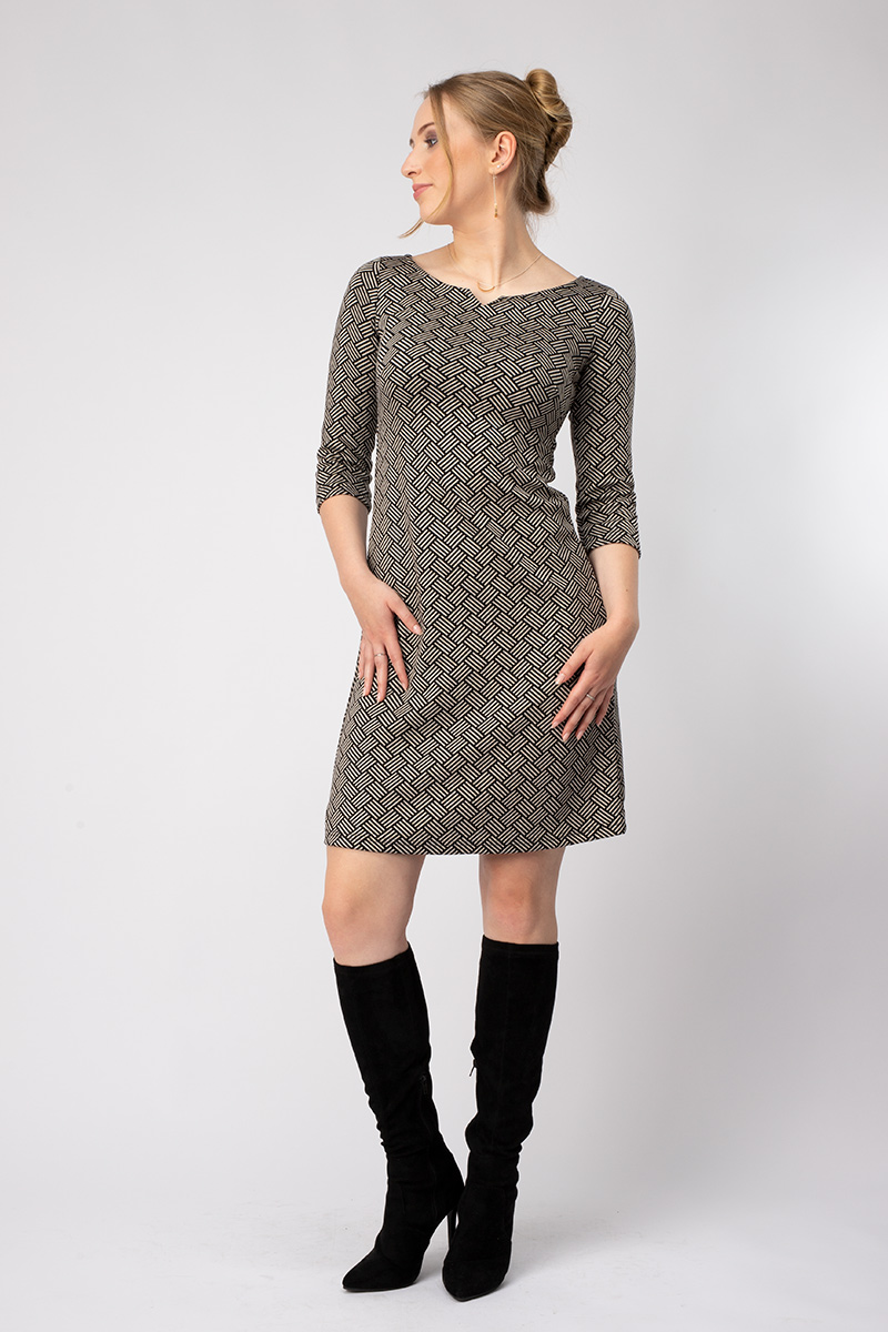 Kleid AUDREY zeichnet sich durch einen geradlinigen Schnitt in leichter A-Form aus. Der Halsausschnitt ist oval mit einem dekorativen „V“ in der Mitte.