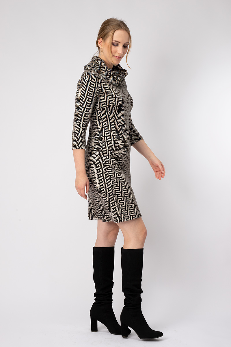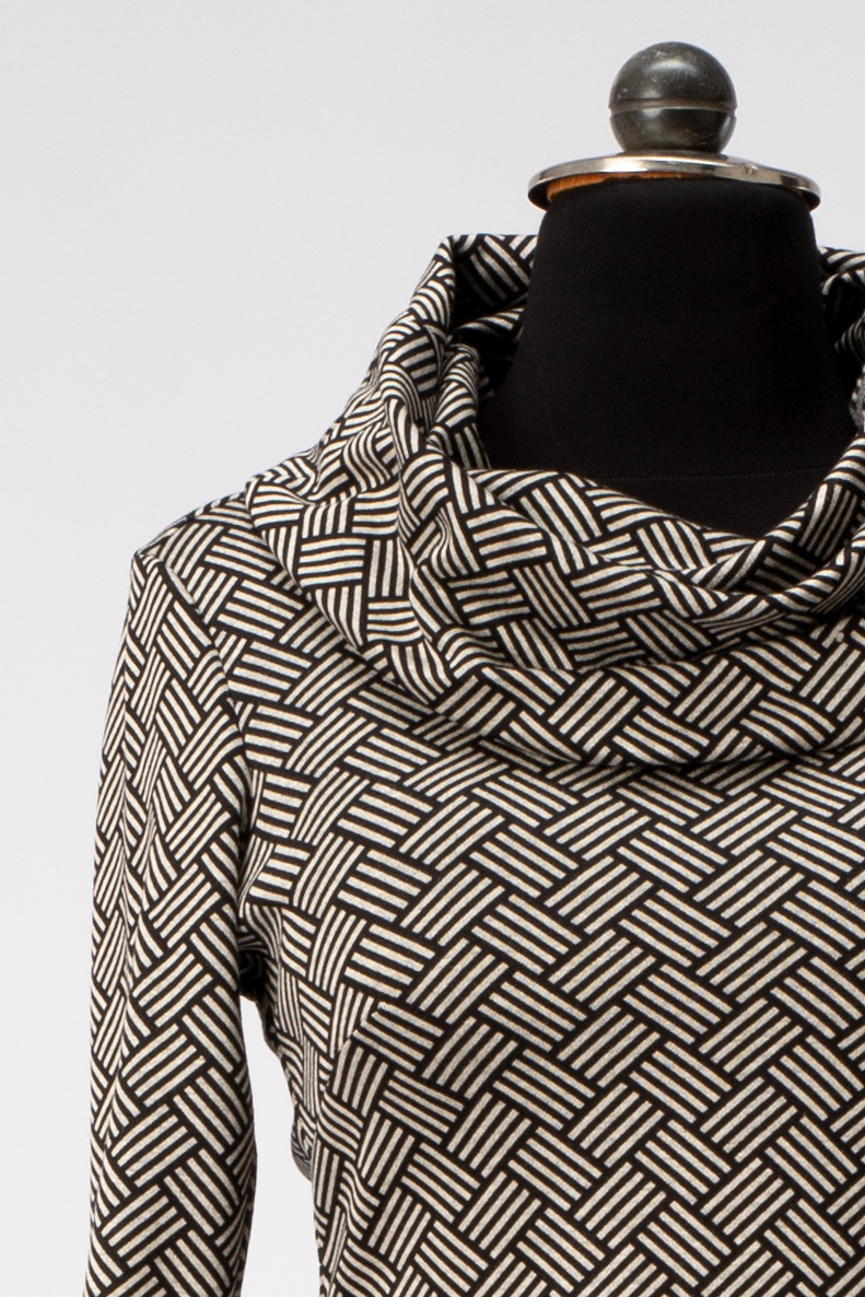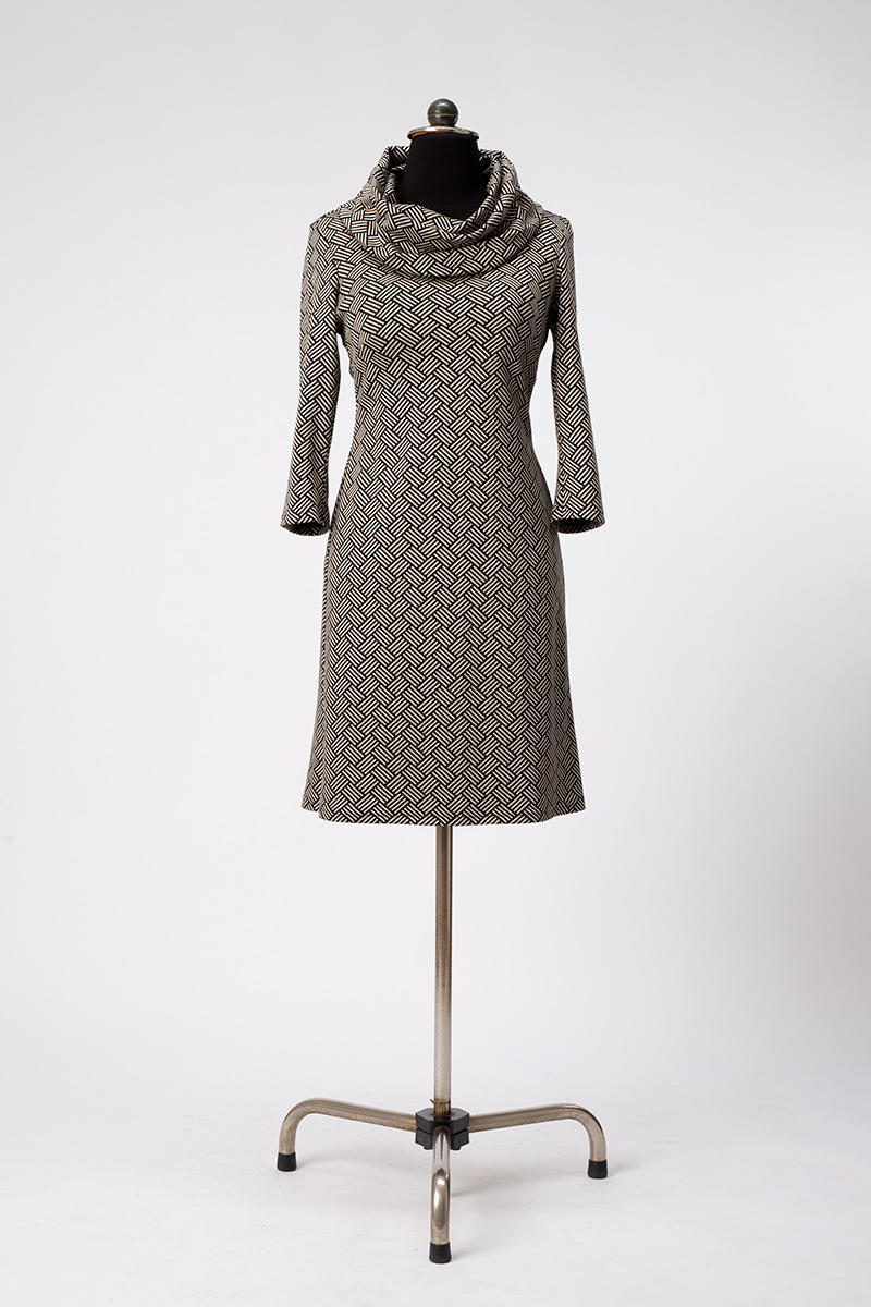 Es ist körpernah geschnitten und trotzdem super bequem. Der leicht ausgestellte Rock verleiht dem Kleid eine A-Silhouette. Der große, kuschelige Kragen ist dekorativ und wärmend. Innen mit einer Kontrastfarbe abgesetzt kann er spielerisch drapiert werden. Der Ärmel ist ¾-lang und am Saum leicht ausgestellt.