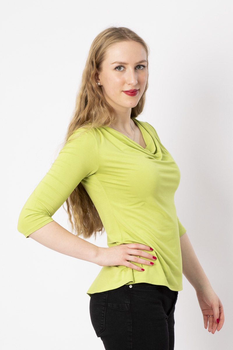 Es ist unglaublich bequem und auch optisch sehr schmeichelnd. Es zaubert durch die Taillierung und das weichfallende Schößchen eine schmale Taille. Sie werden darin eine super Figur machen. – Wasserfall-Ausschnitt – tailliert – Schößchen, vorne kürzer – 3/4 – Armlänge.