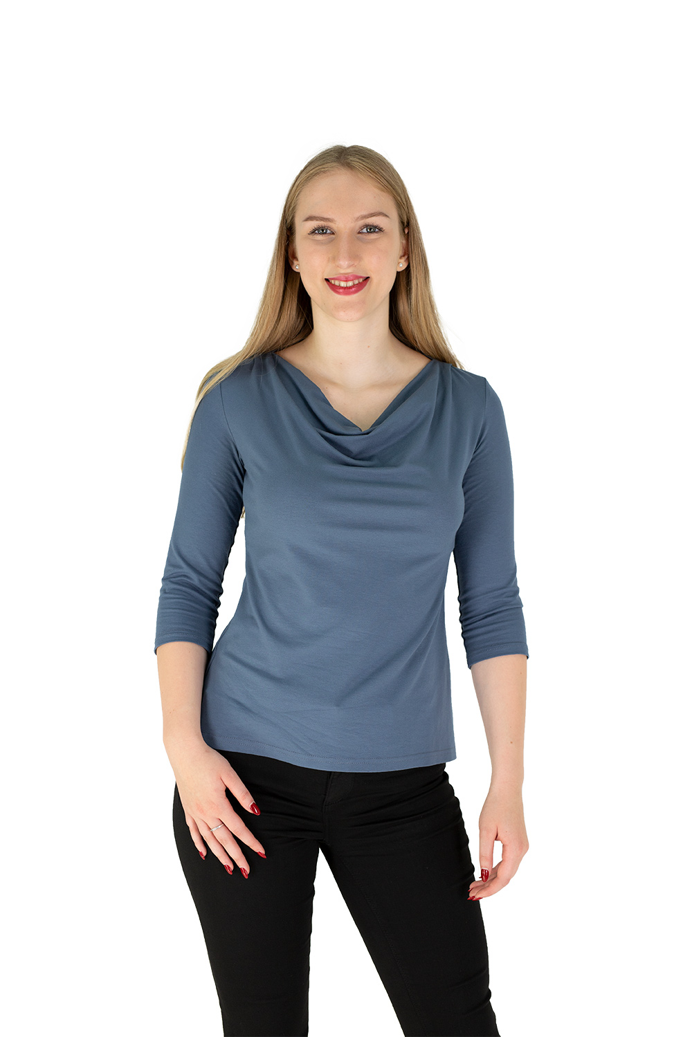 Unser Shirt LIZ ist ein Allrounder, Sie werden es nie wieder hergeben wollen…! Es ist unglaublich bequem und auch optisch sehr schmeichelnd. Es zaubert durch die Taillierung und das weichfallende Schößchen eine schmale Taille. Sie werden darin eine super Figur machen. – Wasserfall-Ausschnitt – tailliert – Schößchen, vorne kürzer – 3/4 – Armlänge Unsere LIZ ist anspruchslos. Kombiniert mit einer Jeans sehr frech und ein perfekter Alltagsbegleiter. Wählen Sie einen Rock als Ergänzung, zeigt es seine feminine Seite…
