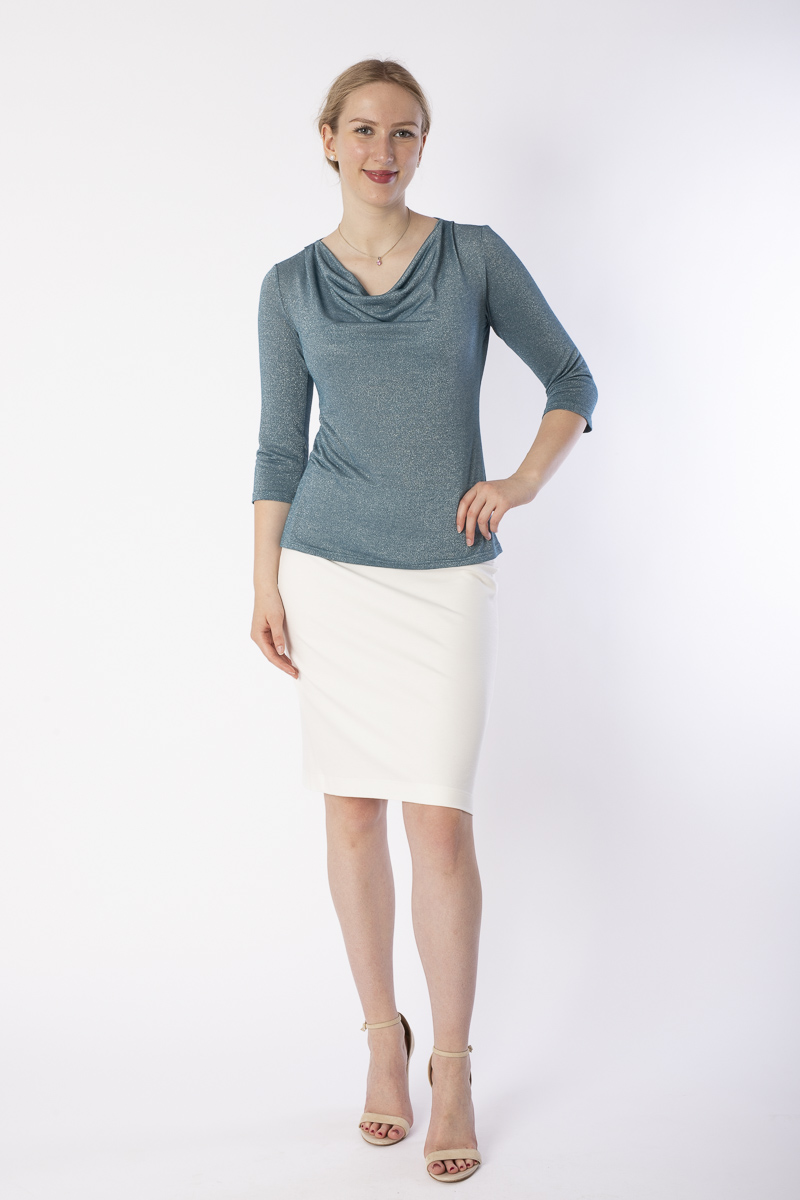 Es ist unglaublich bequem und auch optisch sehr schmeichelnd. Es zaubert durch die Taillierung und das weichfallende Schößchen eine schmale Taille. Sie werden darin eine super Figur machen. – Wasserfall-Ausschnitt – tailliert – Schößchen, vorne kürzer – 3/4 – Armlänge.