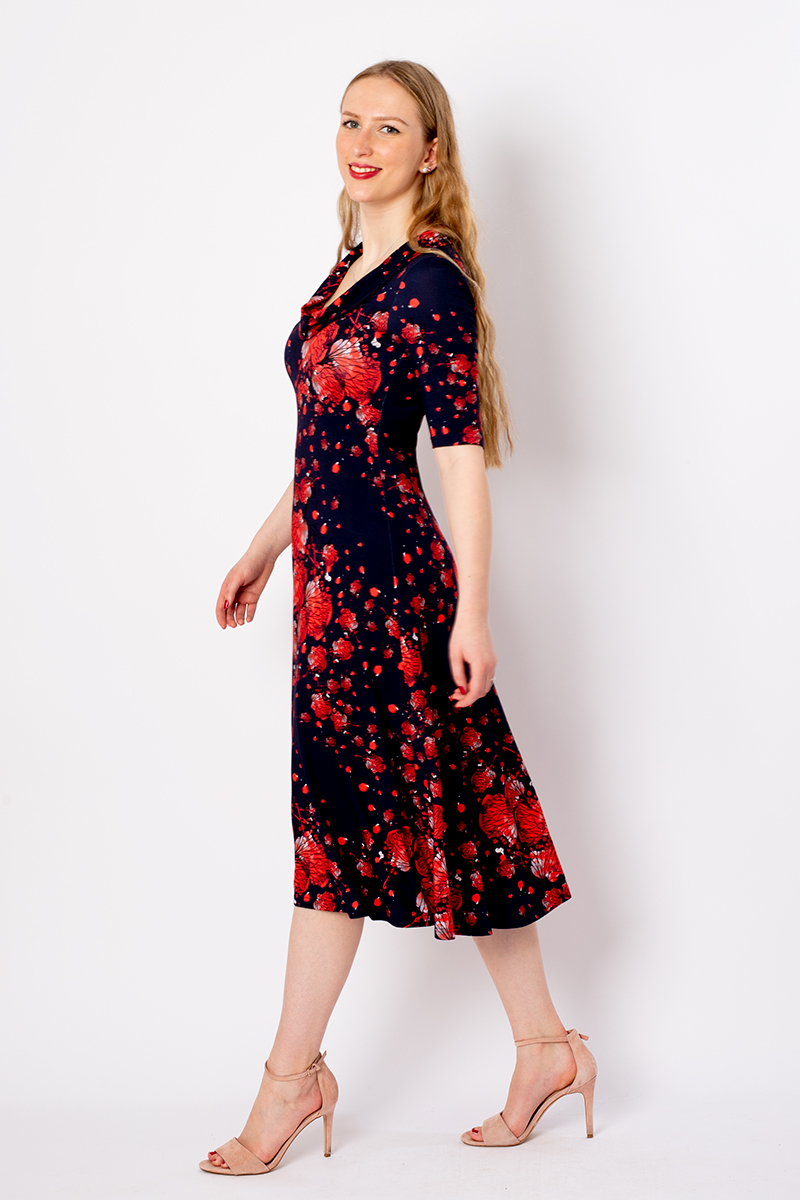 Exklusiver, eigener Print. RedFlakes – Rote Blüten auf dunkelblauem Grund.