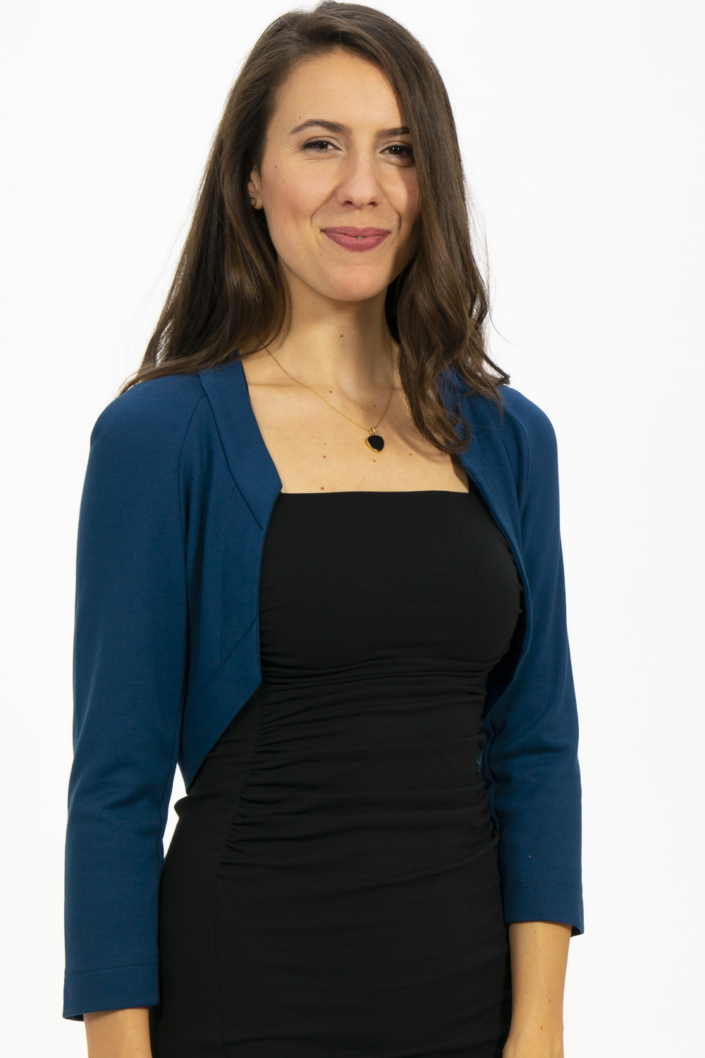 Der Bolero NELE ist wunderbar mit schmalen Jersey-Kleidern kombinierbar und kreiert durch seine schlichte Eleganz ein stilvolles Outfit.