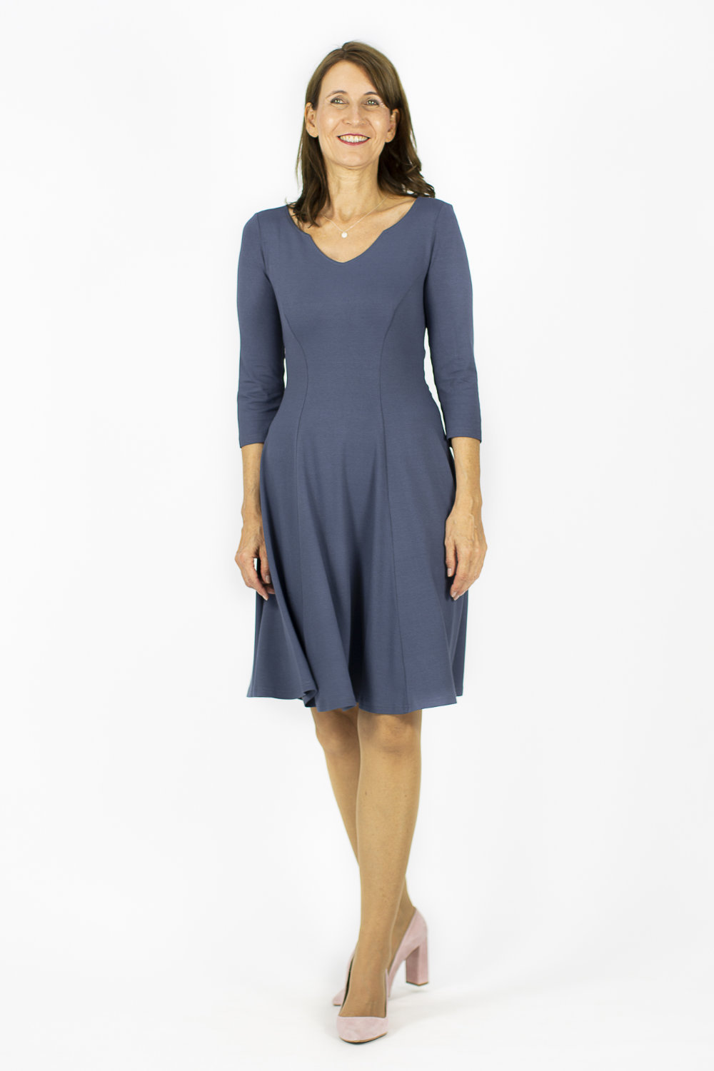 Der außergewöhnlich schöne Ausschnitt setzt ihr Dekolleté in Szene. Prinzessnähte sorgen für eine optimale Passform und strecken die Figur. Der raffinierte Gürtel Wendegürtel zaubert eine Wespentaille. Für eine ruhigere Vorderansicht kann der Gürtel auch im Rücken getragen werden. Weibliche Hüften werden von dem glockigen Rock weich umspielt. Der Saum hat eine schwingende Weite und lädt zum Tanzen ein. Die Ärmellänge ist dreiviertel lang.
